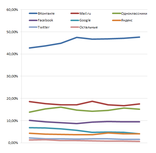 ![]() В конце октября прошлого года мы выпустили наш проект uLogin на просторы интернета, и за последующие 12 месяцев он сумел завоевать доверие тысяч вебмастеров. Сейчас uLogin используют более 10000 сайтов. По итогам последних нескольких месяцев мы провели анализ и собрали занимательные факты о социальной авторизации. Тренды социальной авторизацииВзгляните на следующую диаграмму, отражающую процент авторизаций по различным провайдерам: ![]() Лидирует VK (46,39%), затем идет Mail.ru (17,32%), Одноклассники (14,75%), Facebook (9,05% — достойный результат, учитывая разницу в MAU с нашими родными сетями), Google (5,20%), Яндекс (3,87%), и замыкает семерку лидеров Twitter (1,69% от общего числа авторизаций). Остальные сети суммарно набирают 0,86% (в порядке убывания популярности это Live ID, Youtube, Steam, Живой журнал, Open ID, Last.FM, LinkedIn, Vimeo, Webmoney, Soundcloud, Flickr). Текущие цифры это неплохо, но как же дела обстоят с динамикой? А вот так: ![]() VK стабильно и уверенно набирает обороты, Mail.ru и Одноклассники балансируют общим трафиком туда-сюда (если сложить их графики, то получается ровная прямая), авторизации посредством Google сократились за рассмотренный период на 40%, а через Twitter на 30%. Похоже, пользователи или все больше доверяют нашим сервисам касательно аворизации, либо зарубежные сервисы у нас не растут, несмотря на все заверения их маркетологов. Соцдем и кому легче войти через соцсетьСобранная статистика по социально-демографическим данным дала понять, что существует сильный разброс по возрастам относительно склонности к социальной авторизации, и что мужчины авторизуются гораздо охотнее женщин. Снова посмотрим на факты: ![]() Статистика соцдема лиру против нашей статистики в срезах возрастов и пола. Показательные отличия, но с чем это может быть связано? Или соцдем лиру «несколько неточен», или мы имеем сильно различные факторы прохождения через uLogin по разным срезам. Первая гипотеза не подтвердилась, поэтому будем вести анализ в тезисе правоты соцдема лиру. Изначальное половое распределение (на этапе просмотра виджета социальной авторизации): Мужчины – 41,37%, женщины – 58,63%. После авторизации через социальную сеть: Мужчины – 49,30%, женщины – 50,70%. Несложно заметить, что мужчины авторизуются гораздо чаще женщин (отношение конверсий мужчин к конверсиям женщин будет (49.3/41.37)/(50.7/58.63)=1.378). Итак, если конверсию женщин принять за 100%, то конверсия мужчин составит почти 138%. Солидная разница в 38%. Видимо, мужское население более «продвинутое» в плане технологий, и механизм социальной авторизации им воспринимается более естественно. Интересно, наблюдается ли что-то подобное при обычной регистрации (не сложнее ли женщинам ее проходить? нет ли у кого подобных данных?). Отношение по конкретному срезу (в частности по мужчинам это будет 49.30/41.37=1.19) назовем склонностью к социальному входу, и посмотрим, как она устроена в разрезе возрастов: ![]() Видим, что показатель по мужчинам в 1,19 не является особо выдающимся. Пользователи в возрасте 18-24 имеют этот показатель на уровне 1,57. А людям за 35 несвойственно авторизовываться через социальные сети, в их возрасте и процент проникновения соцсетей не так велик. Мы пришли к портрету самого социально авторизующегося пользователя: это мужчина 18-24 лет, Результаты за год работыСейчас мы уже перевалили отметку в 18 000 000 просмотров виджета ежедневно, имея 3 500 000 уникальных посетителей. На графике пр